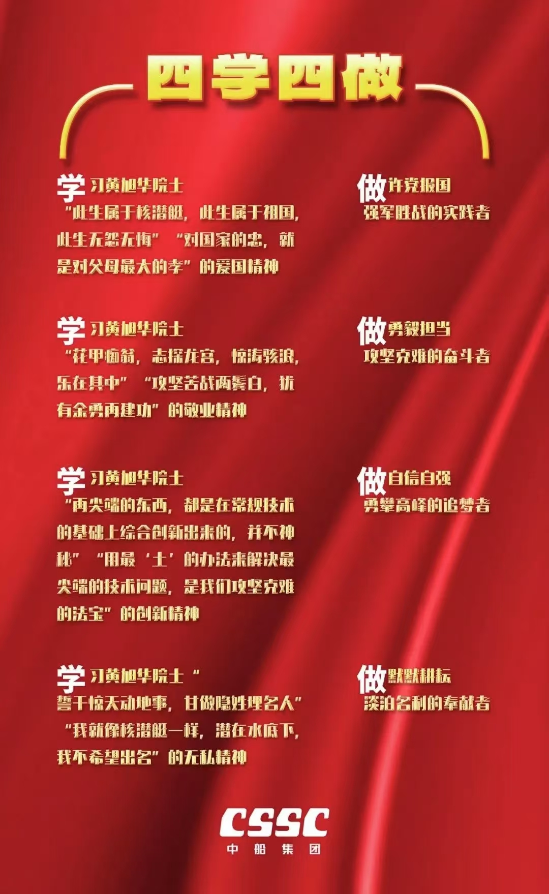 近日,中船集團(tuán)黨組下發(fā)通知,號(hào)召全集團(tuán)深入開展黃旭華院士先進(jìn)事跡“四學(xué)四做”活動(dòng)。公司全體員工要深入學(xué)習(xí)宣傳黃旭華院士先進(jìn)事跡、優(yōu)秀品格和優(yōu)良作風(fēng),繼承黃旭華院士遺志,弘揚(yáng)核潛艇精神,賡續(xù)中船文化,在新時(shí)代新征程中,爭(zhēng)做對(duì)黨忠誠(chéng)、對(duì)事業(yè)執(zhí)著的奮進(jìn)中船人,自覺將個(gè)人奮斗融入到中船集團(tuán)發(fā)展大局中,切實(shí)將學(xué)習(xí)活動(dòng)成效轉(zhuǎn)化為完成全年任務(wù)目標(biāo)、推動(dòng)“十四五”圓滿收官的實(shí)際成效。